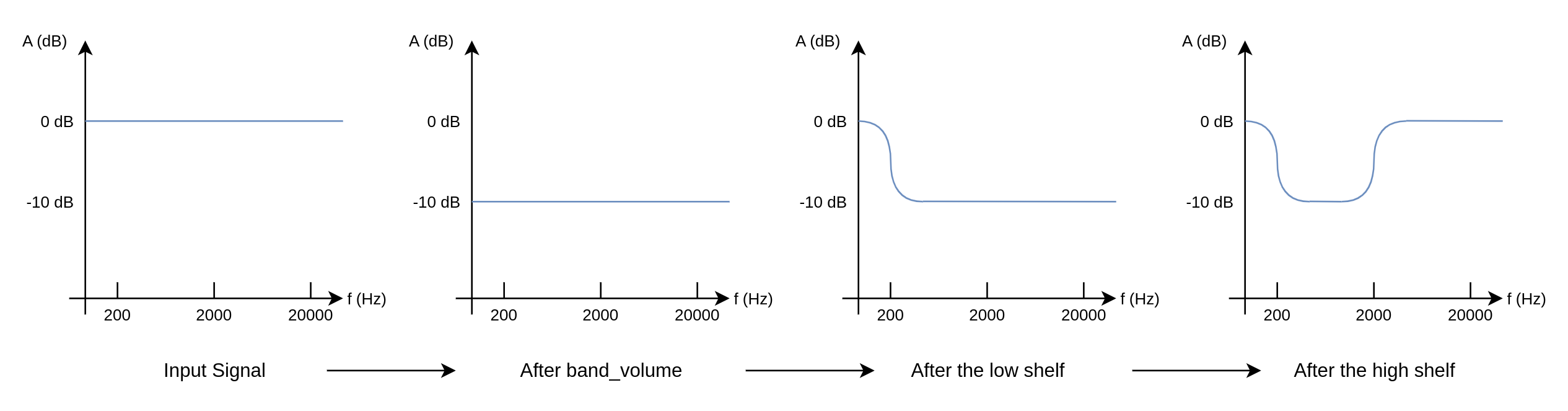 Then it passes through the band_volume module which is part of the band shelf filter. The band shelf filter contains 4 biquad_tdm modules, two of them act as a low shelf filter and the other two act as a high shelf filter. So, how does the band shelving filter work? If you for example want an attenuation of -10dB, you first pass the signal through the band_volume module which will lower the volume of the full bandwidth of the signal with -10dB, then the low and high shelving filters will amplify the low and high frequencies again with +10dB so there will not be any change in volume in those frequency ranges.