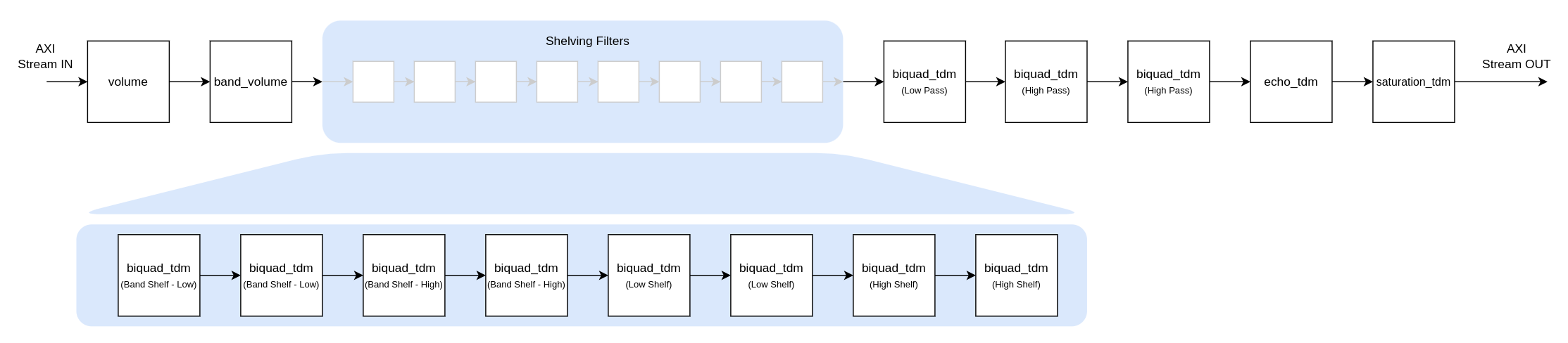 Then the signal passes through the low and high shelving filters, which both use 2 biqued_tdm modules, to control the gain of the low and high frequency bandwidth.
