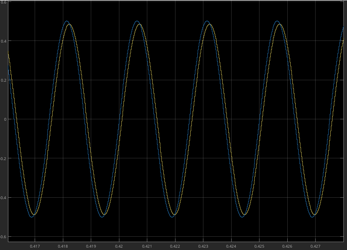 This was the result of simulating the Low Shelf filter with a bandwidth of 400Hz and a gain of +5dB when passing a sine wave of 100Hz and 400Hs through the filter.