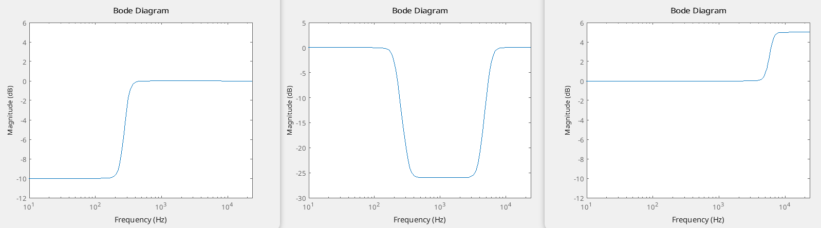 The image above illustrates, from left to right: a Low Shelf filter with a gain of -10dB and a bandwidth of 300Hz, a Band Shelf filter with a gain of -26dB and a bandwidth of 6kHz, and a High Shelf filter with a gain of +5dB and a bandwidth of 18kHz.