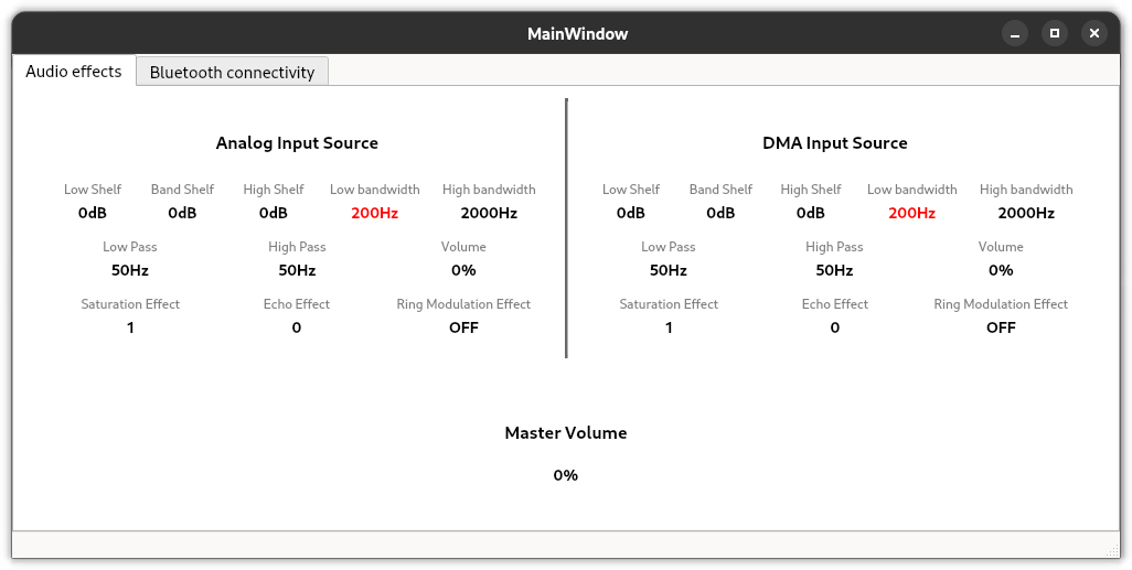 We developed an AudioEffectWidget class that inherits from QWidget to manage the control of effects and filters on the analog and DMA audio signals. This includes a great deal of QLabels to visualise all the current values for frequencies, effect parameters, gains and so on.