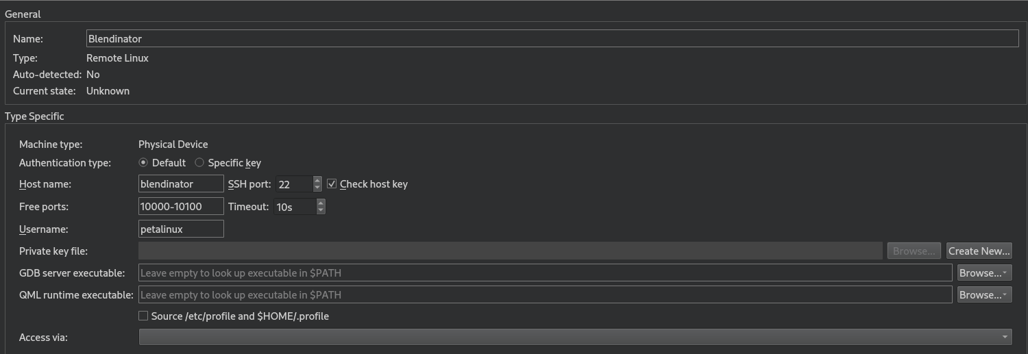 When this is done, we added a device in Qt Creator to connect to the Ultra96-v2. In the image below you can see all the settings that allowed us to connect to the FPGA from inside of Qt Creator using SSH.