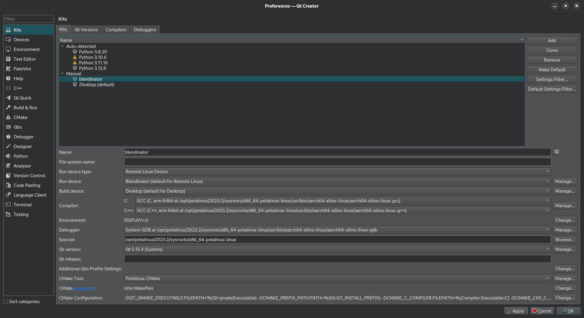 Qt Creator groups settings used for building and running projects as kits to make cross-platform and cross-configuration development easier. Hence, Wwe then created a kit in Qt Creator and selected the run device, C and C++ compilers, debugger, sysroot and Qt version from SDK as you can see in the image below.